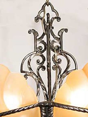 Here is the most outstanding, top-of-the-line fixture of the Devon Group, made circa 1934. Having 5 shades, it is just so classy. Those side slip shades were made with a strap to help hold them in position, instead of popping out too easily.
