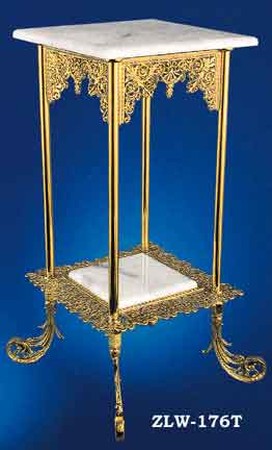 pictured here also are a few charming additions to a room holding this chandelier. Tie into the beautiful pierced brass detail on the canopy and fitters by using newel post light 299-FGE-NW . We sell many beautiful brass pieces to complement period decor, such as the andirons and marble-top table below. We also sell solid brass door and furniture hardware to match period decor.