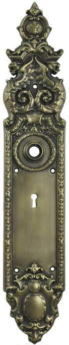 L-DK26 Antique Brass Finish Victorian Style Brass Heraldic Door Plate with Skeleton Keyhole {PICTURED}