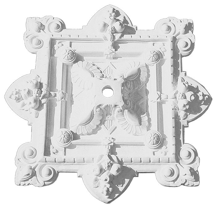 Pottery Plaster Hand Cast ceiling medallion. Beautiful square design with a cluster of fruit highlighting each side. This genuine plaster decoration accepts paint beautifully, and would really emphasize your classic ceilings or lights. A cornucopia design would look appropriate not only with Victorian decor, but the square edges work well with Colonial, Mission, and Arts & Crafts homes, too.