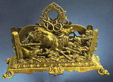 Outdoorsman motif double letter holder of a stag being pursued by two dogs over a foliated fence. A miniature piece of art cast in silicone bronze!