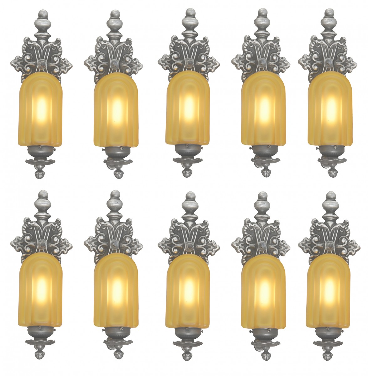 Wonderful set of SIX (formerly ten) matching 1920’s period Art Deco Sconces. And since they are sold by PAIRS, it might be advised to check quantity remaining if wishing to order more than just one pair.