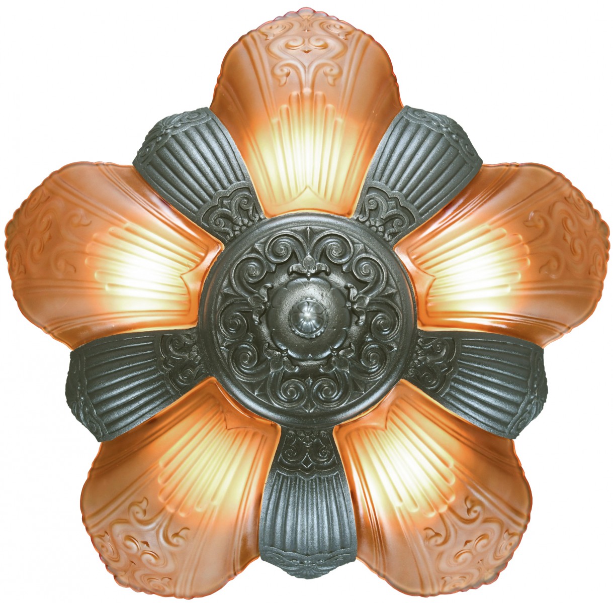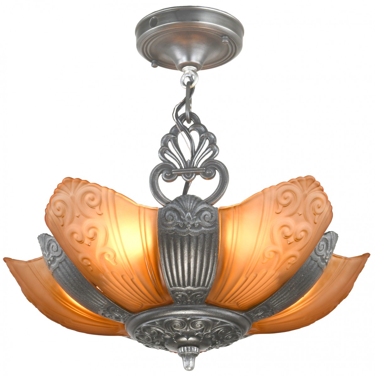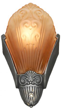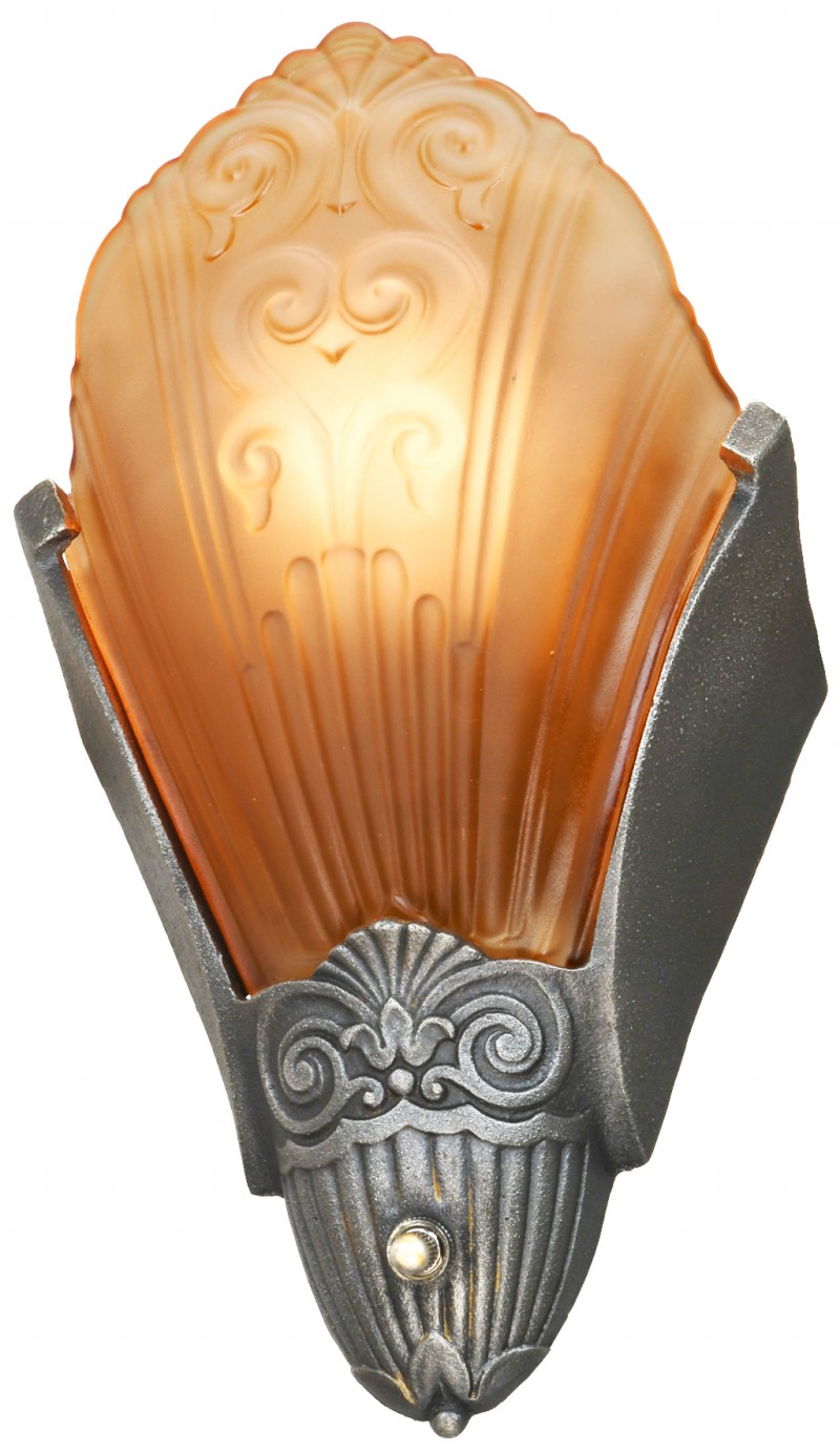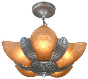 This, hard-to-find matching set, is The Ashbury Series Art Deco slip shade chandelier and matching sconces that were made by Virden ca.1934-36. The entire series was cast iron and has a pleasant, old pewter finish. It was also offered, by Virden, in Old Gold.