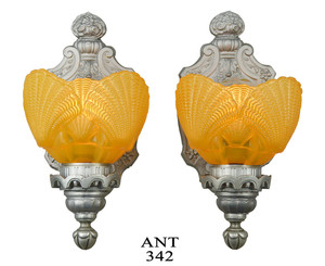 Lovely set of circa 1920's wall sconces. Original antique sconces with amazing shell motif antique amber shades.