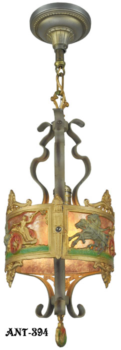 This pendant has a Roman chariot scene inside the framed borders, and each is backed by a mica rim. A single bulb graces the center.