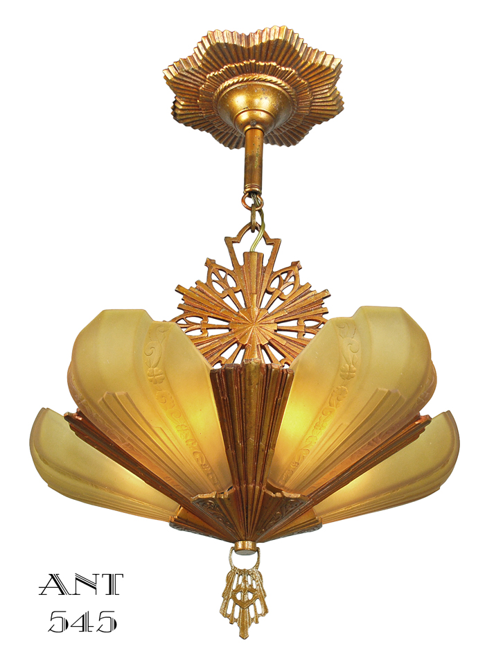This is an Art Deco slip shade chandelier by Virden, circa 1934-36. It was his model 8035 from the Rayburn series, and was top the line, since they never made a 6 light version.