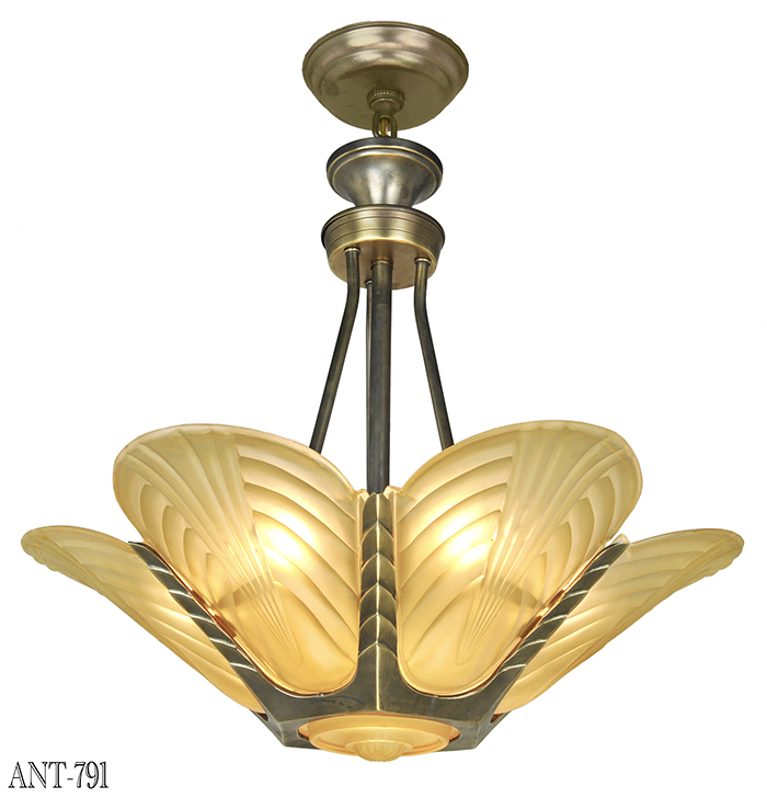This nice French chandelier has SIX slip shades on the outside...each lit with one socket...and a bottom shade lit with a single medium base socket. It is worth mentioning that the slip shades have the same pattern as the struts that hold them. We could call this design Streamline Deco without a doubt. They really do give a Streamline feeling.