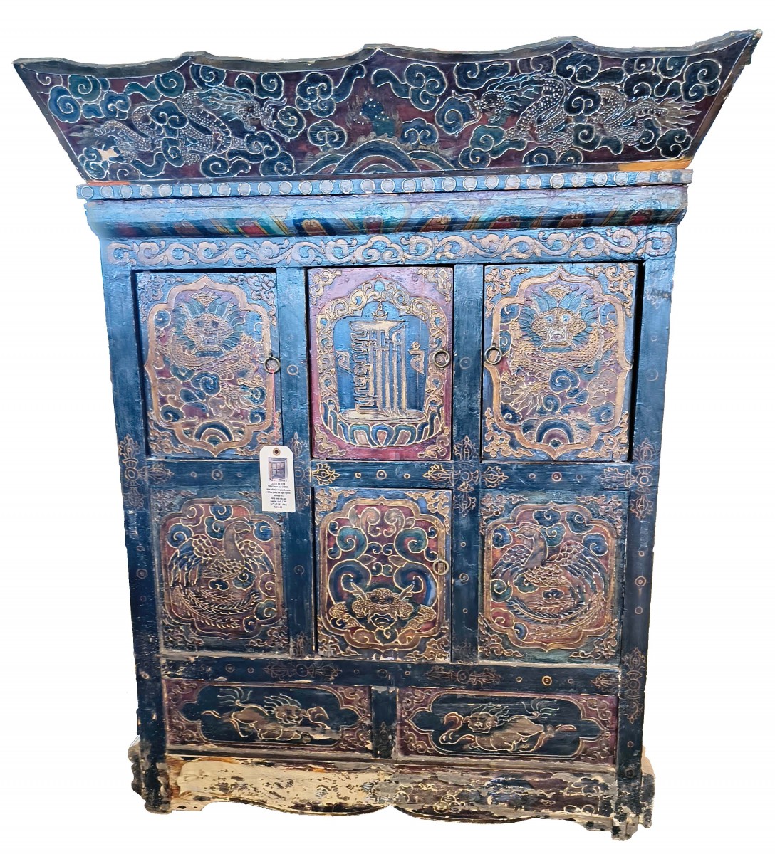 Cabinet with paint over gesso decoration with lions, phoenix and dragon vignettes. Believed to be a Tibetan monk's robe chest.