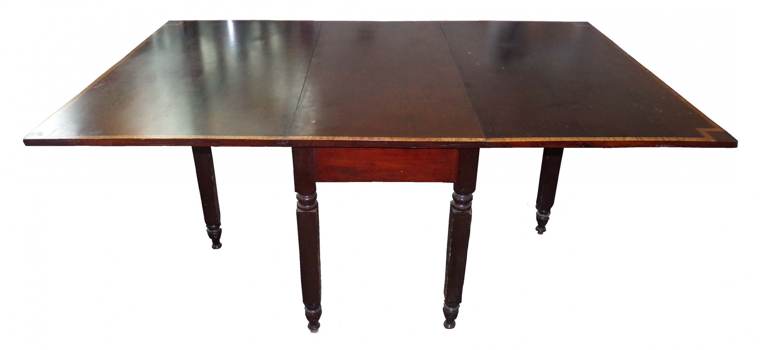 American Circa 1840 old mahogany, with lovely satinwood banding, drop leaf table. For someone who appreciates the old gentle restrained early Victorian lines but with very useful functionality, this is a wonder of refinement. Nice turned legs.