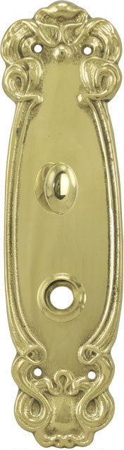 Door Plate for interior door when using our exterior door plate for cylinder lock. This lovely Art Nouveau Series is all solid cast brass. We offer a beautiful reproduction Art Nouveau doorknob that matches. We offer this suite in three finishes: polished, unlacquered brass; darkened "antique brass" patina, and an aged pewter finish.