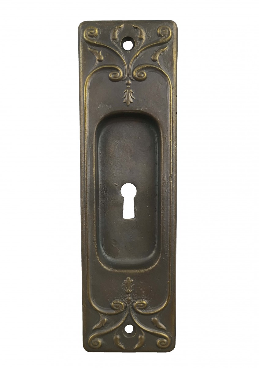 Fine, heavily wrought (not stamped) recessed pocket door handle. Thickness of the brass is .06".